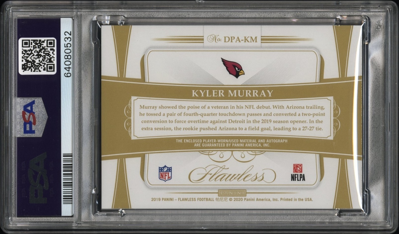 2019 Panini Flawless Kyler Murray Rookie Dual Patch Autographs Silver /20 #DPAKM PSA 9