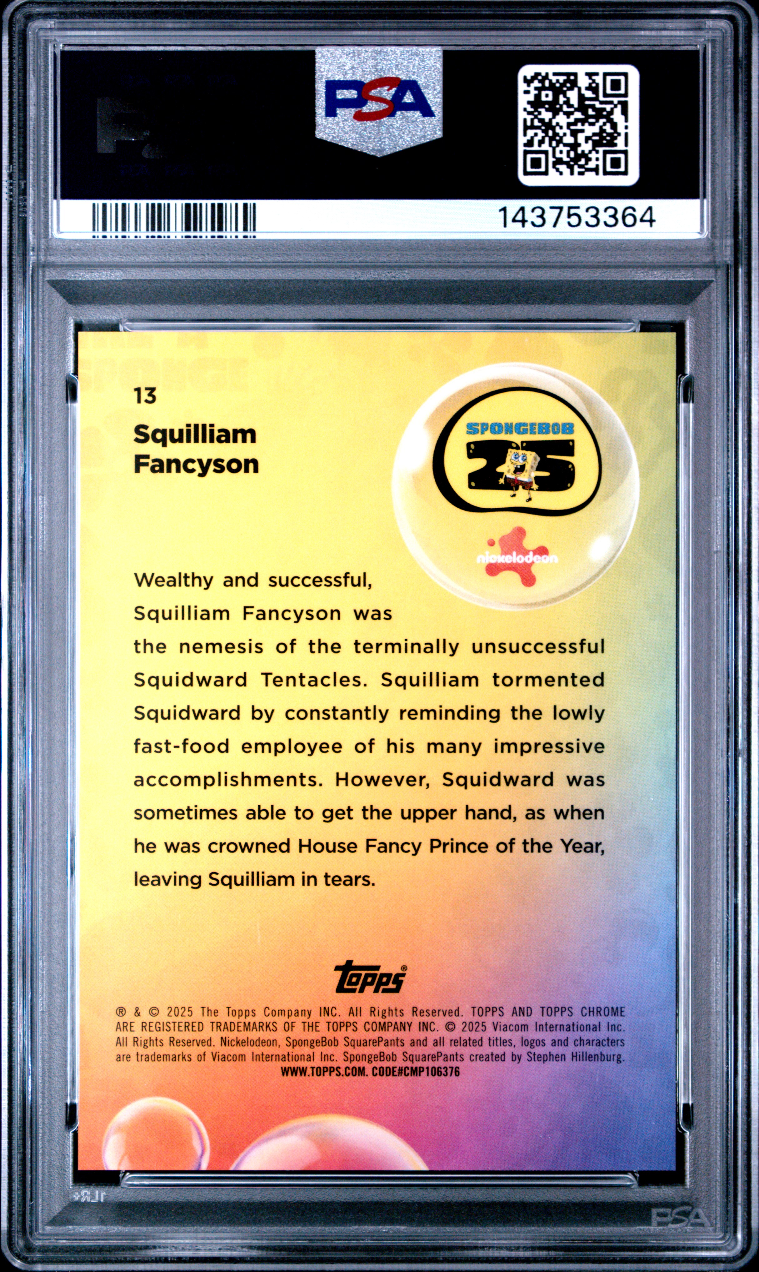2025 Topps Chrome Sapphire SpongeBob Squilliam Fancyson Gold /50 #13 PSA 9