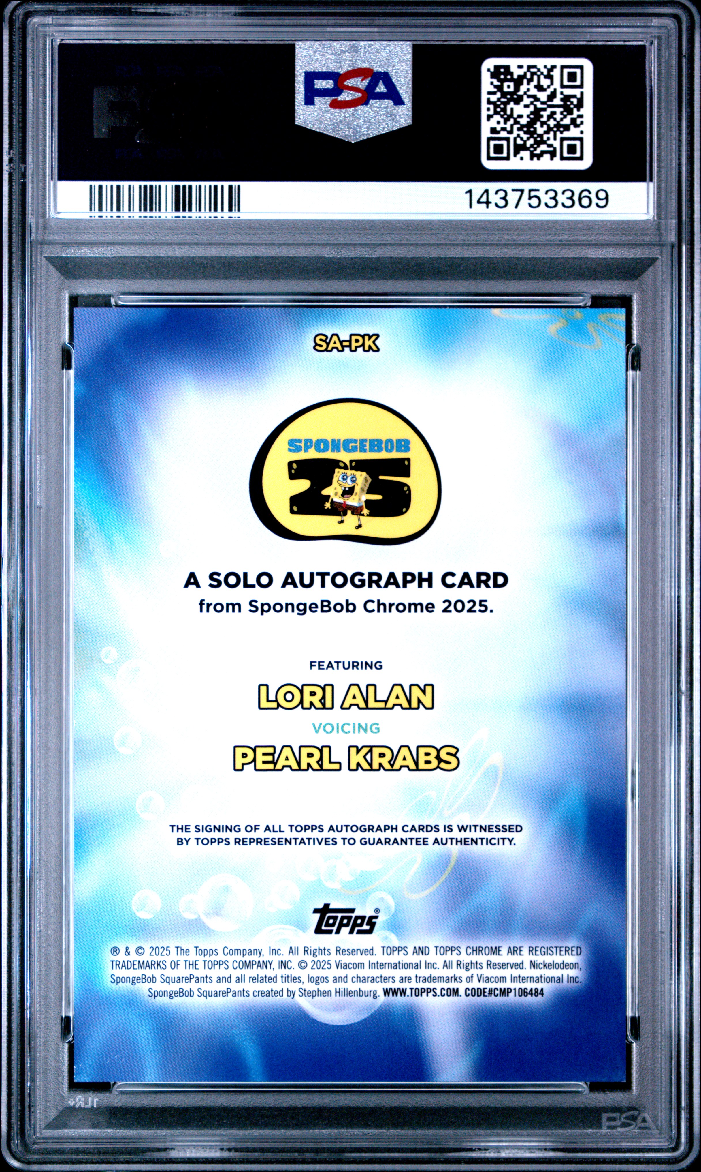 2025 Topps Chrome Sapphire SpongeBob Pearl Krabs Lori Alan Auto #SA-PK PSA 9