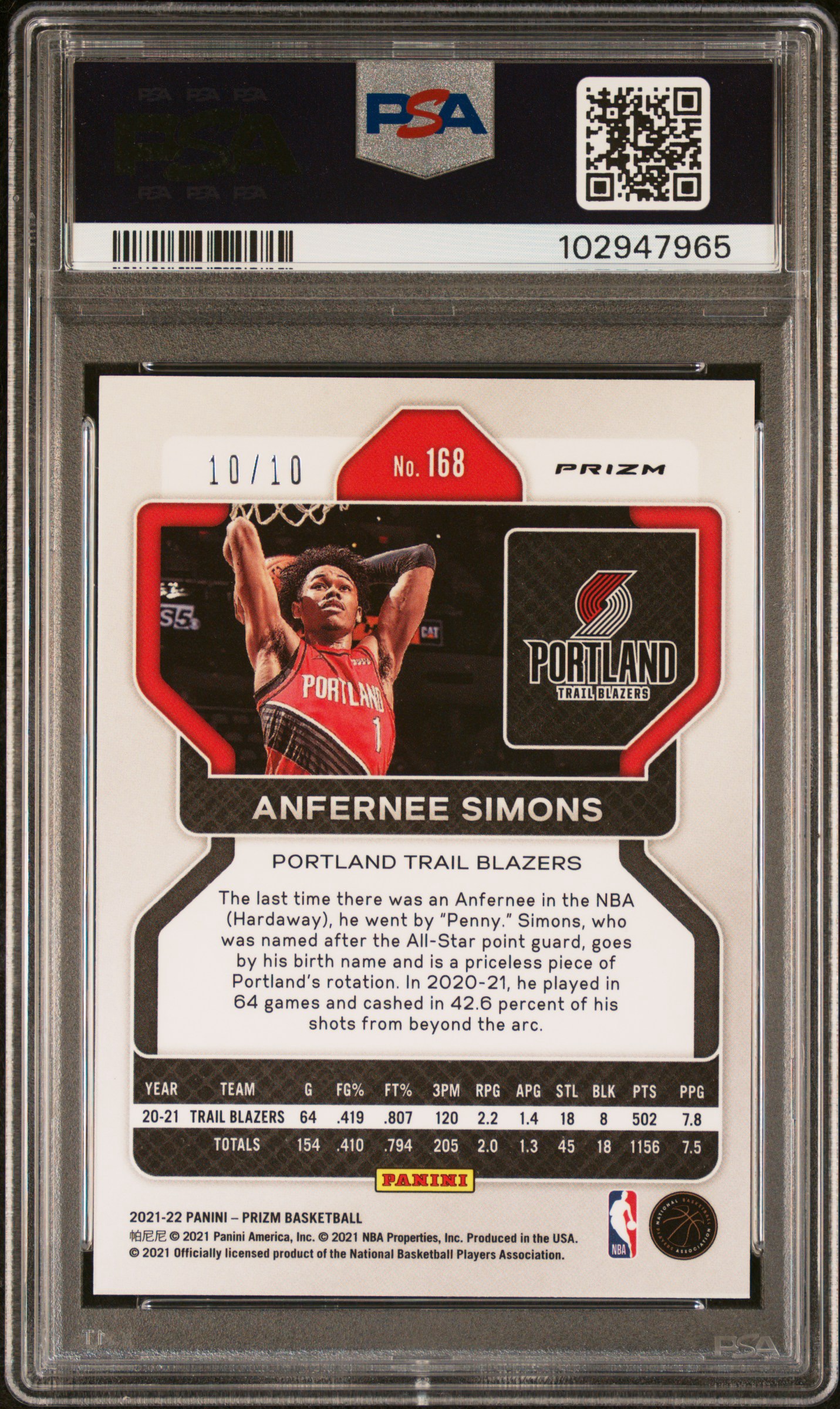 2021 Panini Prizm Anfernee Simons Gold /10 #168 PSA 10