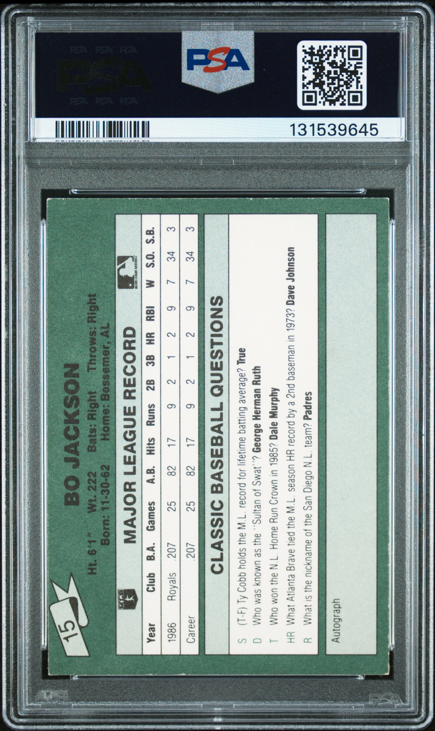 1987 Classic MLB Game Bo Jackson #15 PSA 5