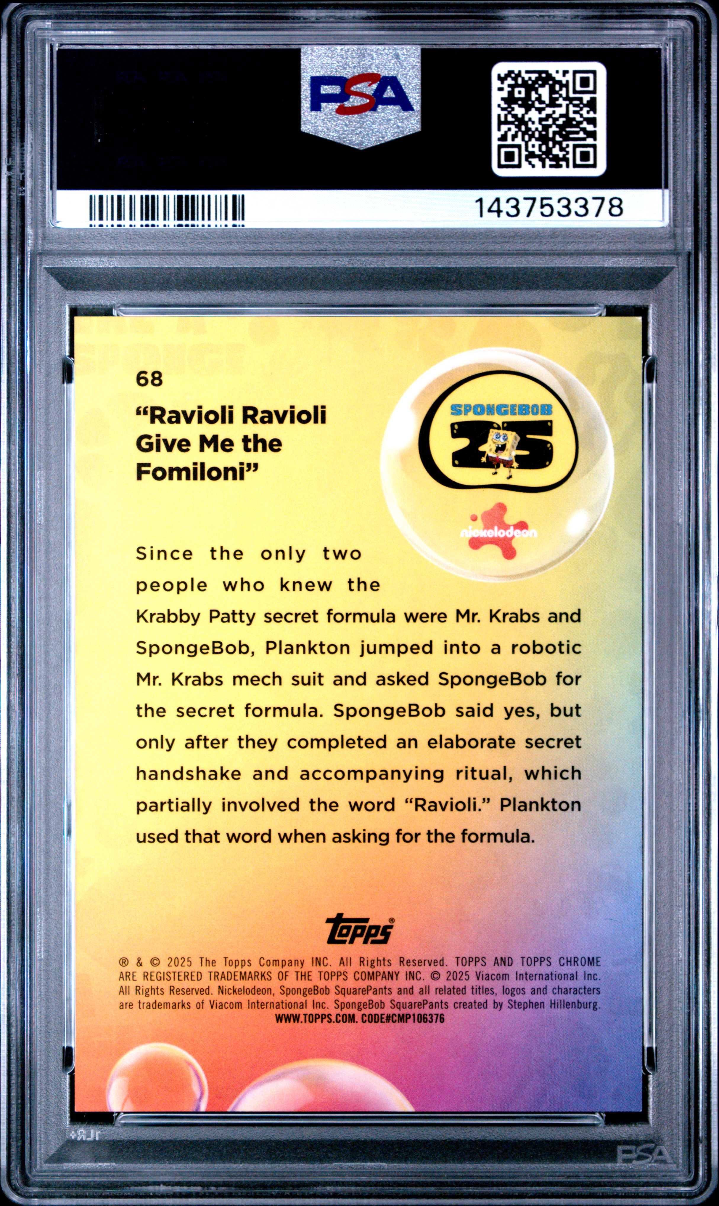 2025 Topps Chrome Sapphire SpongeBob Ravioli Give Me Formuoli Orange /25 PSA 8