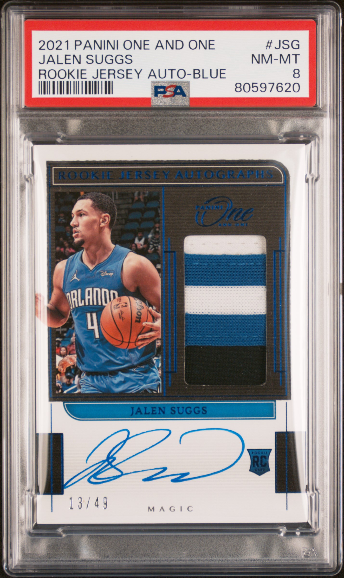 2021 Panini One and One Jalen Suggs Rookie Jersey Auto Blue RPA /49 #JSG PSA 8