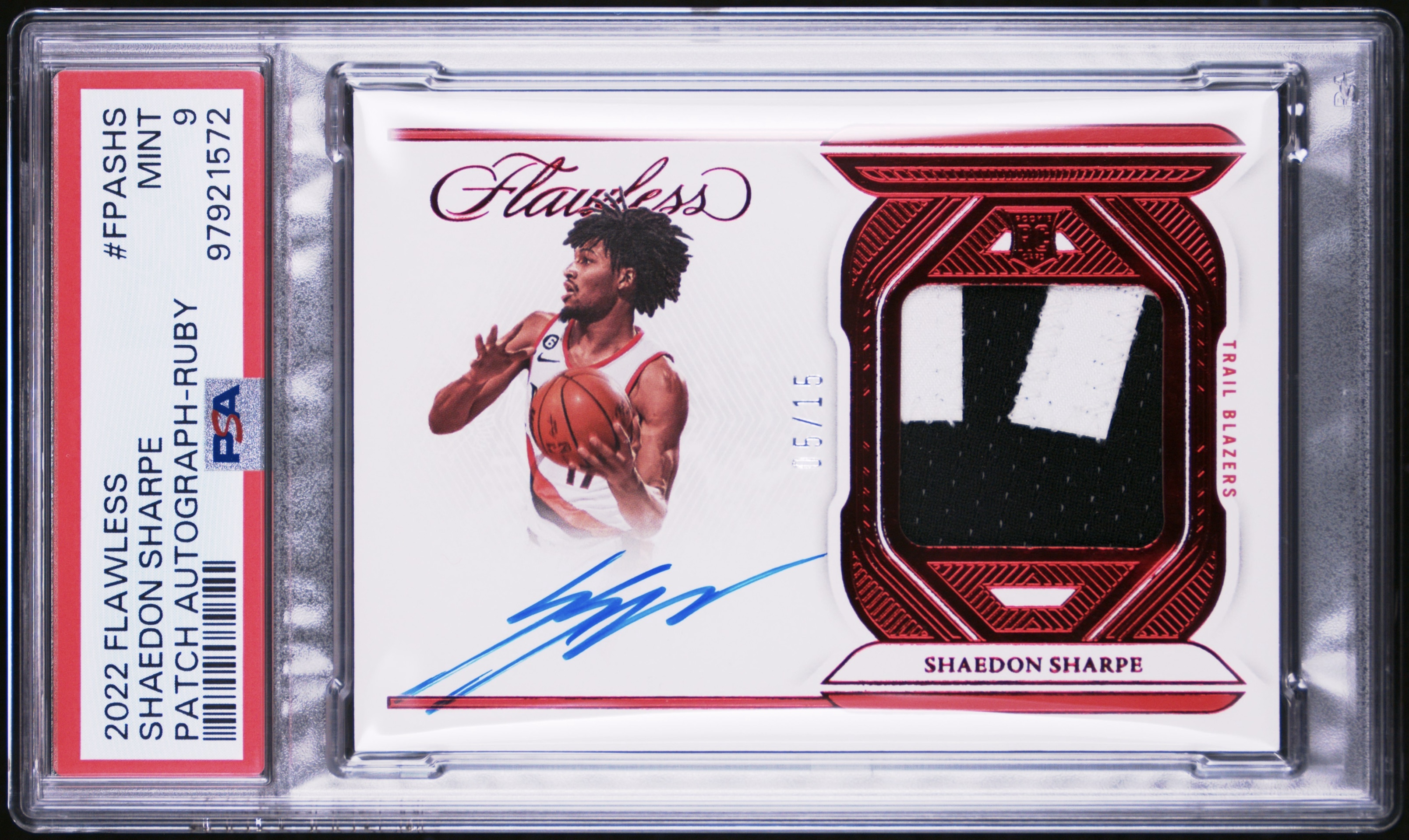 2022 Panini Flawless Shaedon Sharpe Patch Autograph Ruby /15 #FPASHS PSA 9