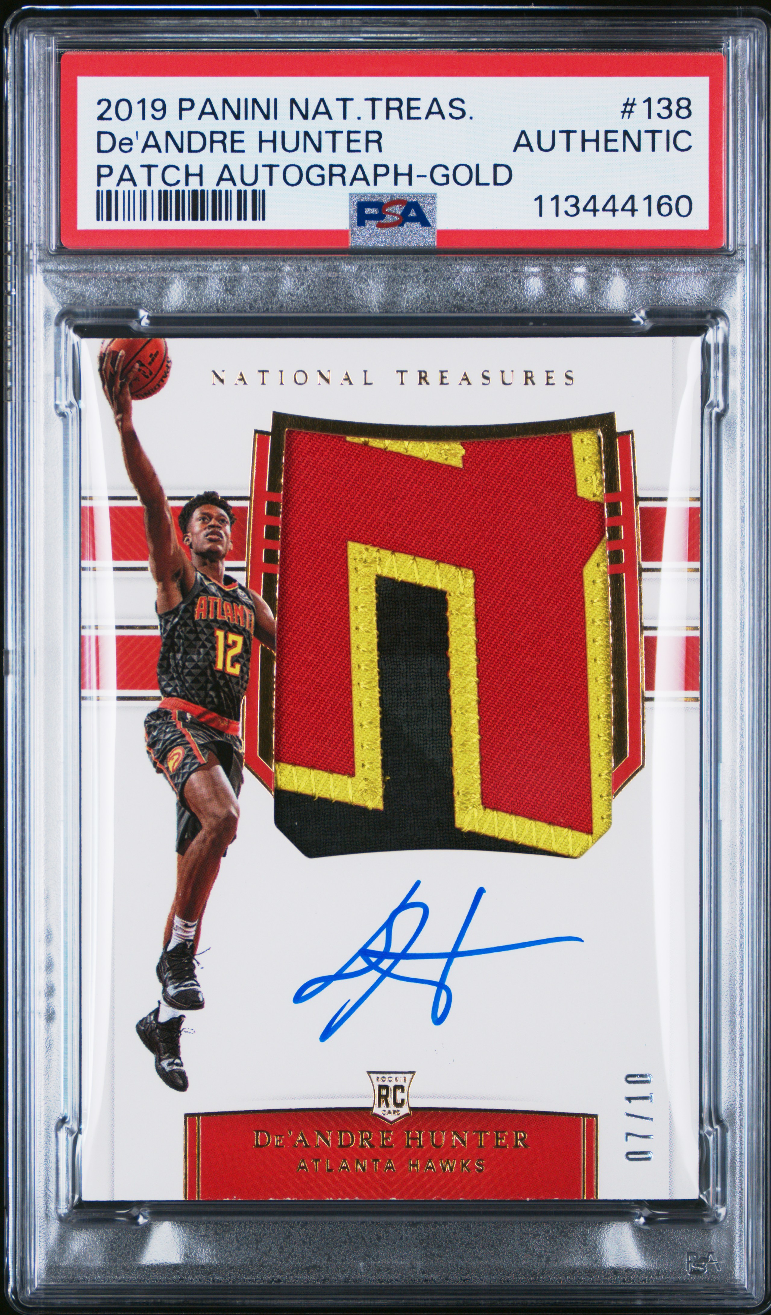 2019 Panini National Treasures De'Andre Hunter Rookie Patch Autographs Gold /10 #138 PSA 10